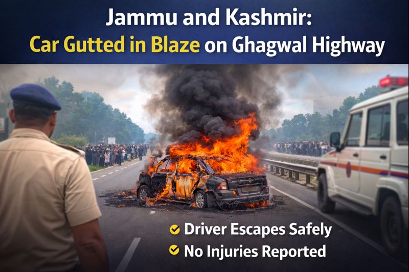 A car was completely gutted in a fire on the Ghagwal highway near Bari Brahmana in Samba district on Tuesday, causing panic among commuters and attracting a large crowd. Driver Escapes as Vehicle Erupts in Flames Eyewitnesses reported that the driver noticed smoke coming from the car while driving and pulled over immediately to the